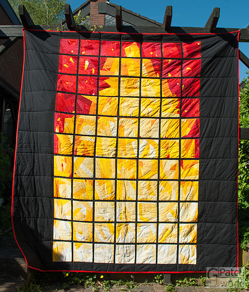 Ein wahres Liebhaberstück! Zunächst wurde aus ca. 16 verschiedenen Gelb-, Orange- und Rottönen 77 Quadrate in freier Patchworktechnik so gearbeitet, dass später in Reihen sortiert ein prasselndes Feuer zu erkennen ist. Alle Quadrate wurden mit schmalen schwarzen Streifen erst zu Reihen, später zur Fläche zusammengenäht. Mit Volumenvlies und einer unifarbigen Rückseite verbunden wurde diese Decke mit der Nähmaschine Quadrat für Quadrat umrundet und gequiltet. So entstand in unzählbaren Stunden diese Decke für ein Einzelbett! Eine unbezahlbare Arbeit, die nur eine Mutter verschenken kann!