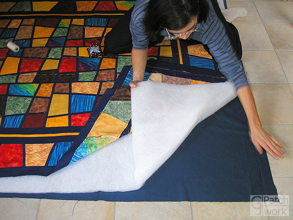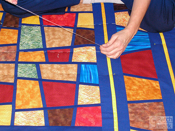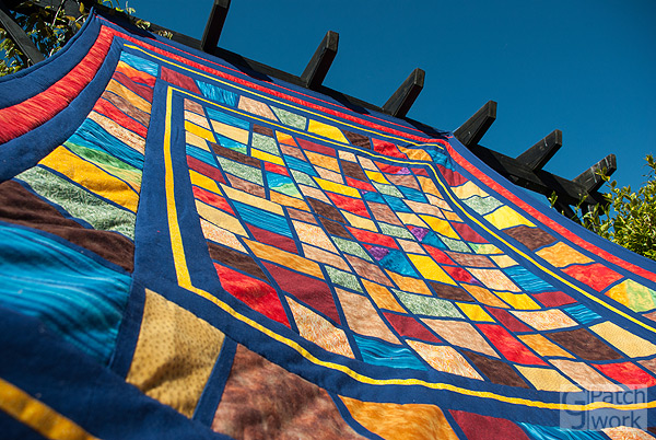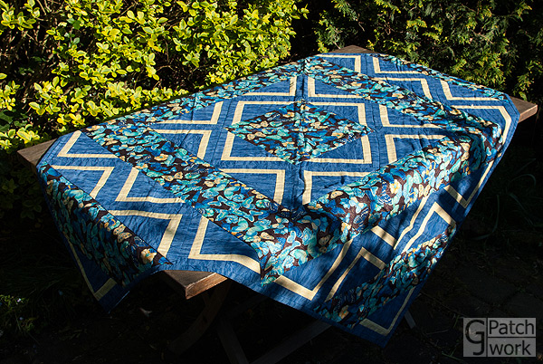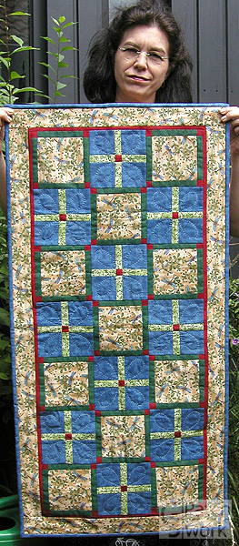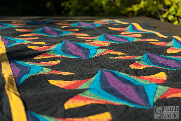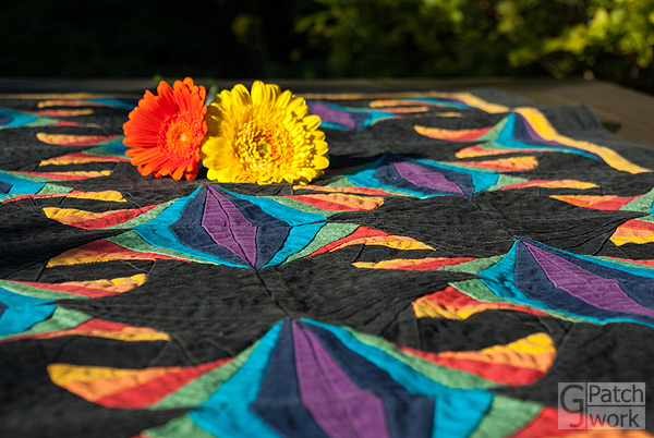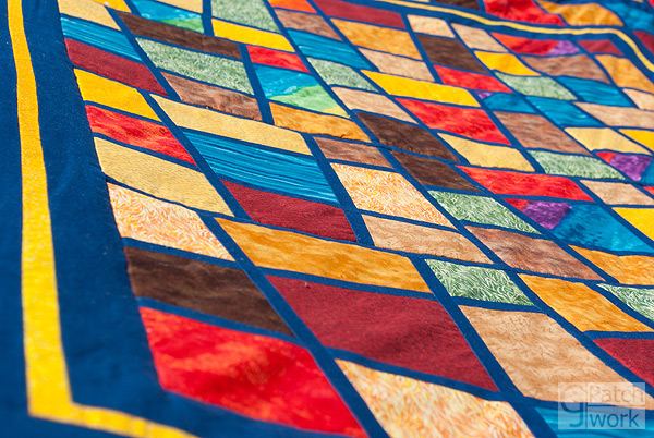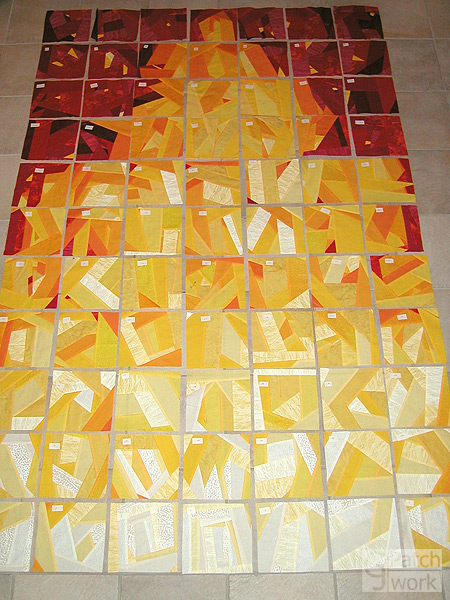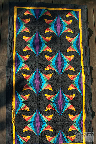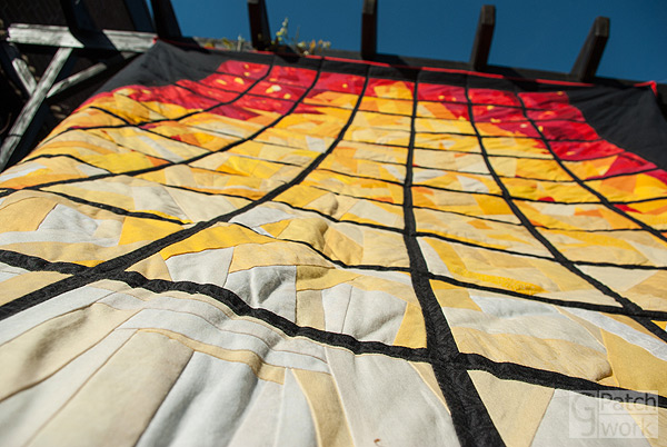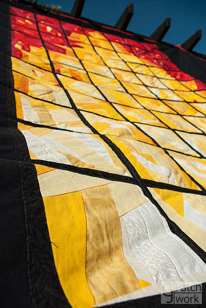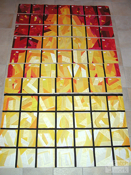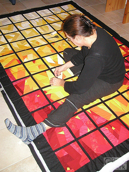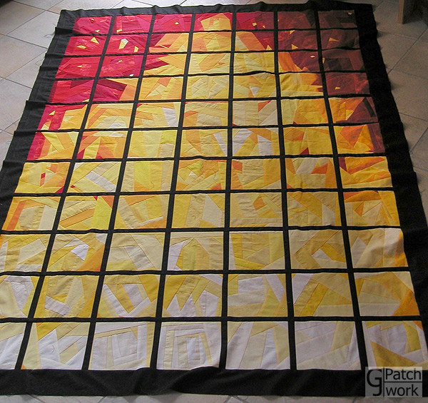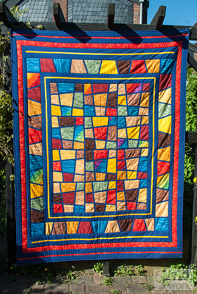 Mit einem kleinen Quadrat beginnt jedes einzelne Teil. Daran werden schmale Streifen sorgsam aneinandergesetzt und nach jeder Naht speziell geschnitten. 21 fertig gestellte Quadrate bilden schließlich dieses schwungvolle Gesamtergebnis. |