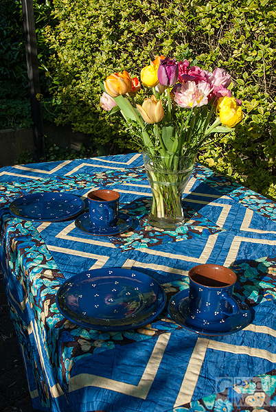 Wunderschöne blaue Libellen tummeln sich auf diesem Baumwollstoff. 11 Libellenquadrate werden mit farblich passenden Patchworkquadraten zu einem Tischläufer zusammengesetzt. Ergänzend zu den zarten Flügelpaaren der Libellen, sind auf dem blauen Stoff handgequiltete „Flügel“, die dieser quirligen Libellenschar zusätzlich Bewegung verleihen. |