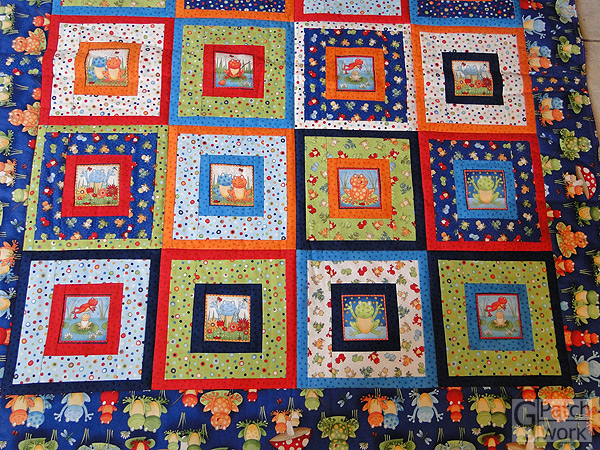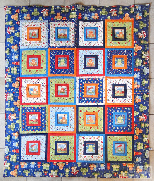 In der Mitte hüpfen zwanzig lustige Frösche kreuz und quer über diese herrliche Krabbeldecke! Von klein auf machen es sich die Kinder auf diesem mit weichem Vlies gefüllten Quilt bequem, und haben, umgeben von so vielen bunten Fröschen, immer etwas zu beobachten. Die Rückseite ist ein farblich passender weicher Vliesstoff, der zusätzlich Wärme und Liegekomfort bietet. |
