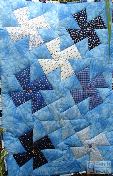 24 Quadrate in verschiedenen Blautönen werden so gearbeitet, dass sich nach der Zusammensetzung acht Windmühlen auf dieser schönen Babydecke drehen. In der Mitte jeder Windmühle ist ein hübscher kleiner Kinderknopf befestigt. Mit weichem Volumenvlies gefüllt, wird sich jedes Baby auf dem Boden wohlfühlen. |