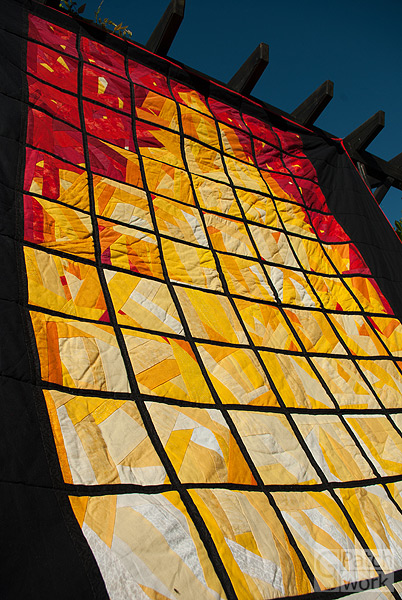Ein wahres Liebhaberstück! Zunächst wurde aus ca. 16 verschiedenen Gelb-, Orange- und Rottönen 77 Quadrate in freier Patchworktechnik so gearbeitet, dass später in Reihen sortiert ein prasselndes Feuer zu erkennen ist. Alle Quadrate wurden mit schmalen schwarzen Streifen erst zu Reihen, später zur Fläche zusammengenäht. Mit Volumenvlies und einer unifarbigen Rückseite verbunden wurde diese Decke mit der Nähmaschine Quadrat für Quadrat umrundet und gequiltet. So entstand in unzählbaren Stunden diese Decke für ein Einzelbett! Eine unbezahlbare Arbeit, die nur eine Mutter verschenken kann!